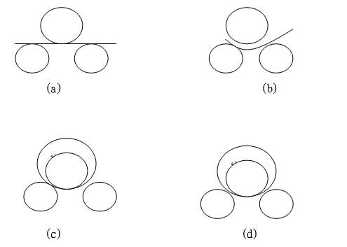 該機(jī)結(jié)構(gòu)形式為三輥對稱式。上輥在兩下輥中間對稱位置作垂直升降運(yùn)動,通過蝸輪、蝸桿而獲得,兩下輥?zhàn)餍D(zhuǎn)運(yùn)動,通過減速機(jī)的輸出齒輪與下輥齒輪嚙合,實(shí)現(xiàn)板材的行走。當(dāng)上輥的下壓力超過材料的屈服限度時,便使所卷制的材料變形,變形過程如下圖: