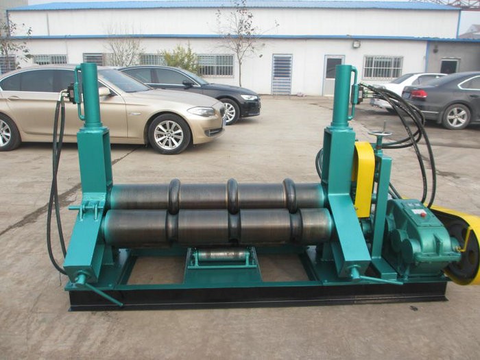 該機結構形式為三輥非對稱式。側輥在兩直列輥中間對稱位置作平衡升降運動,通過絲杠、絲母而獲得,兩直列輥作旋轉夾緊送料運動,通過減速機的輸出齒輪與下輥齒輪嚙合,實現板材的行走。當側輥輥的下壓力超過材料的屈服限度時,便使所卷制的材料變形,從而達到卷制直徑達大?。?br />
